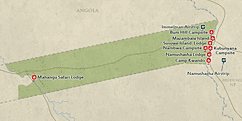 The park is bordered by the Okavango and Kwando rivers. The main habitat is deciduous woodland with Zambezi teak and wild seringa. A scenic highlight is the Horseshoe Bend, an oxbow lake with white sandy beaches, surrounded by Zambezi teak.
