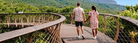 Head west to the lush forests of Tsitsikamma National Park. Stroll across the famous suspension bridge at Storms River Mouth, surrounded by dramatic coastal scenery. Later, visit Birds of Eden, the world’s largest free-flight aviary, and Monkeyland Sanctuary, home to rescued primates.