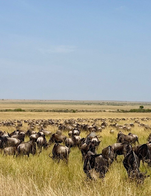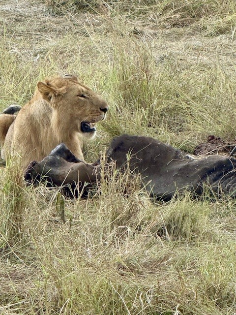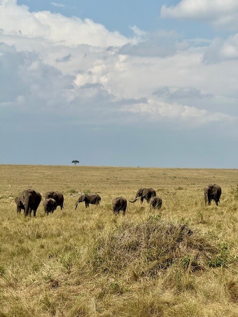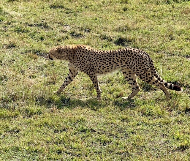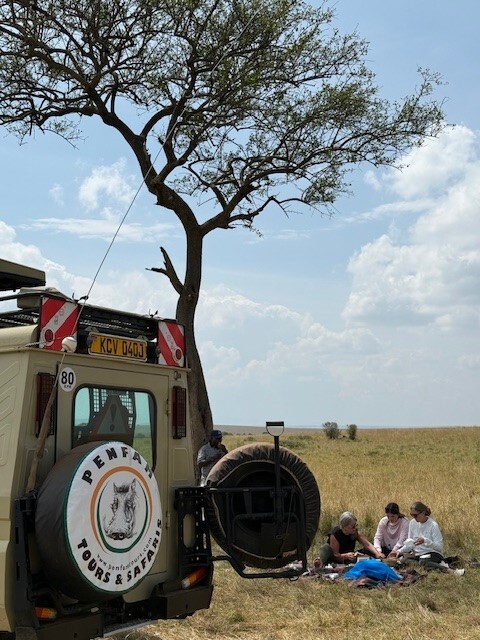 Every trip has its glitches and ours was that our daughter fell quite ill the night before we were planning to drive to the Masai Mara. Peter drove us to the Nairobi Hospital the following morning, where he assured us she would receive excellent care and she did! We left the hospital and drove to the Masai Mara, where we stayed in the Saruni Base Camp luxury tents. Peter took us on several safaris, where we saw Lion, Cheetah, Elephant, Buffalo, Rhino, Giraffe, and much more.  The highlight was watching a Leopard take down a Bushbuck….We were in the Mara during the great migration, so there were many other safari drivers and tourists. We were shocked to find that many of the drivers were not behaving themselves – they were boxing in animals and racing into the action, frightening the animals and cutting off other driver’s views. Peter was the utmost professional – he took great care to position the safari vehicle in just the right place for the perfect view and photo, while also making sure the animals were respected, and advising us on safety protocols. He also found us a lovely spot, where he laid out a blanket for us to have a picnic lunch under an acacia tree. As a side note, Penfam provided chilled bottles of water during our Nairobi tour days and a 5-gallon bottle of water with an electric pump in the Mara, to fill personalized reusable stainless steel water bottles which Penfam provided us with. Peter also thoroughly cleaned the vehicle between safaris, since it can get quite dusty at times. After a few days in the Mara, Peter drove us back to Nairobi, taking another route with a beautiful view of some tea farms.  One piece of advice; if you want to see the migration you should book your trip at least a year in advance because this is the peak season for travel in Kenya.  The best accommodations fill up fast.  We booked ours 8 months in advance and we were very lucky to get the Saruni Base Camp.