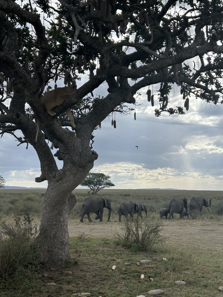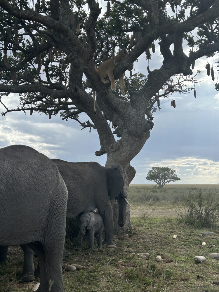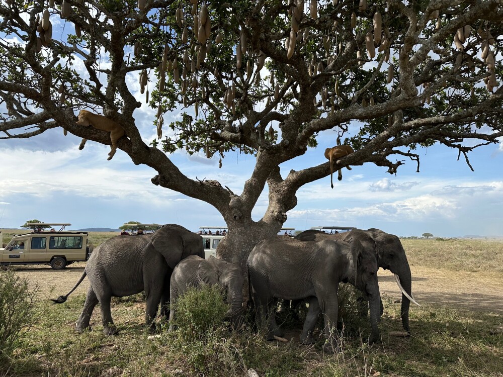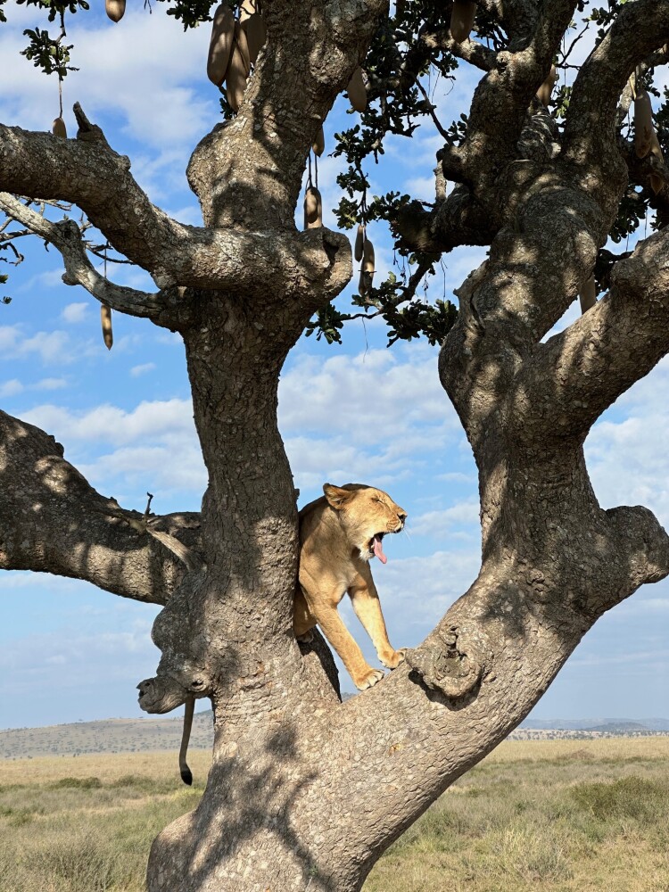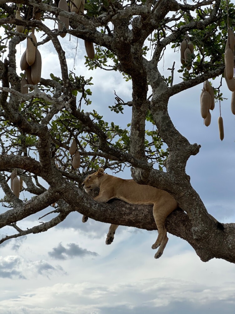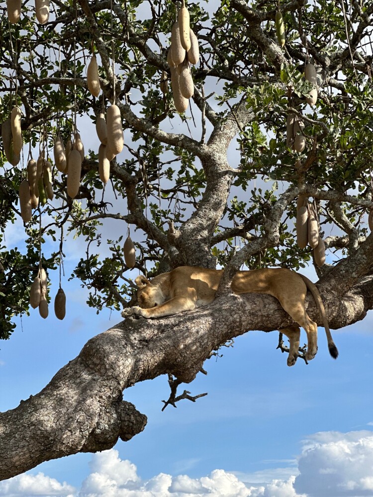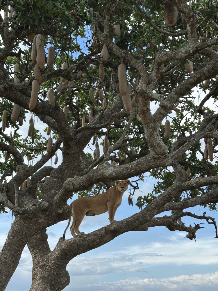 For example, we were in the Serengeti, and there was a sausage tree. Two lionesses were sitting in the tree, and when we arrived, two lion cubs had just run into the tall grass to hide.