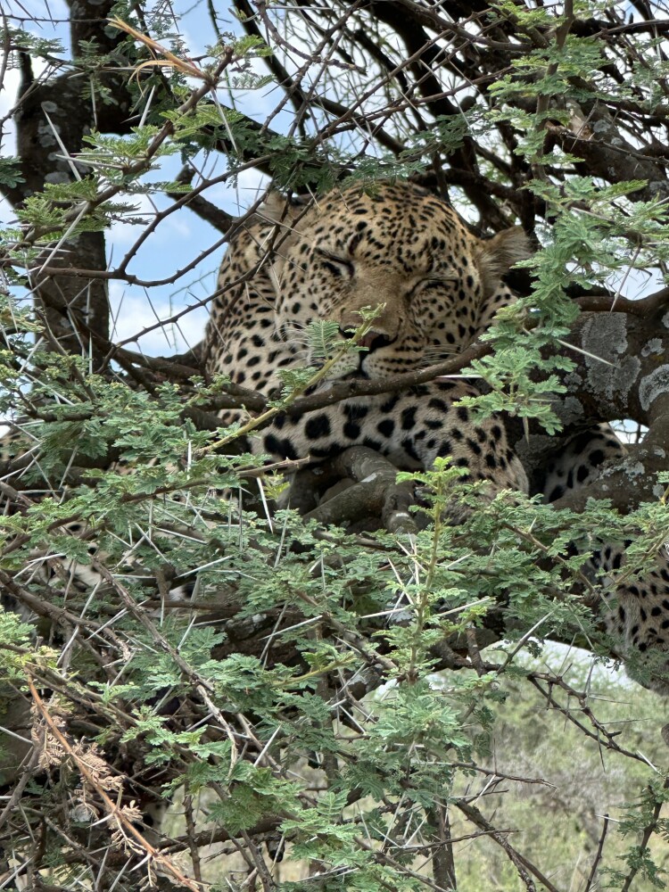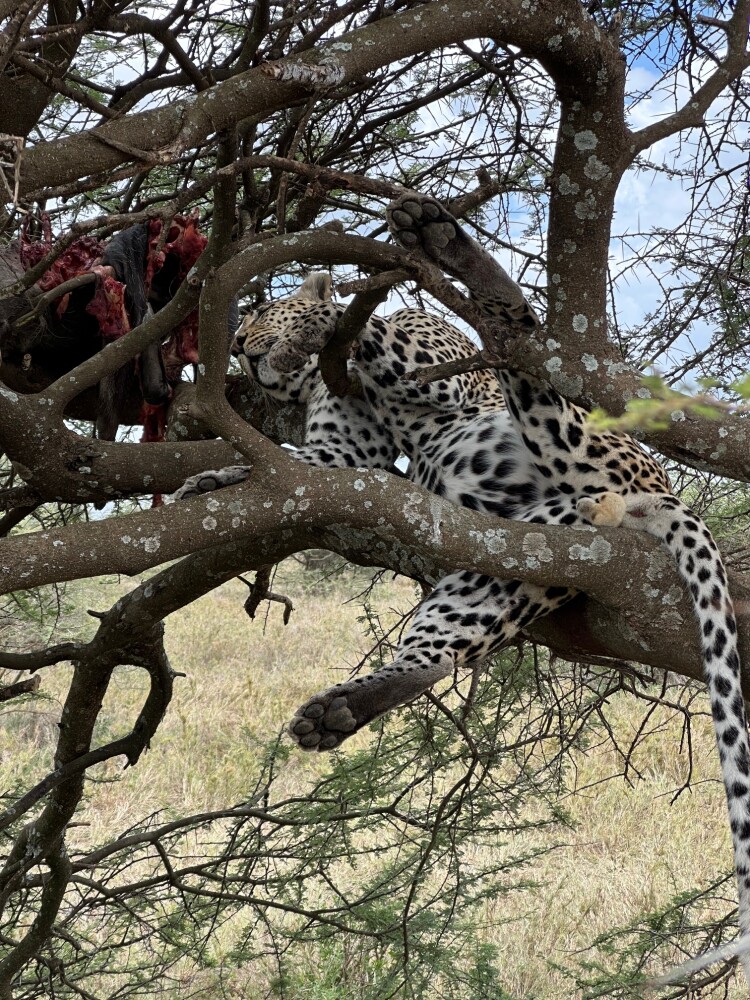 Another highlight for me was a leopard that had apparently killed a wild boar the night before. It was lying with its prey in a fallen tree, and we had a perfect view of everything. The leopard was quite sleepy and had a really swollen belly. Thanks to our excellent timing, we had as much time to observe as we wanted.